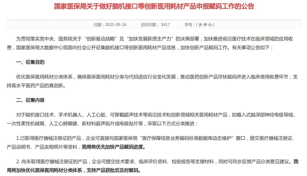 国家医保局始终旗帜鲜明支持创新药械高质量发展。针对脑机接口这一前沿领域,医保部门提前布局、主动谋划,预先启动了一系列赋能举措。2025年3月,印发神经系统医疗服务价格项目立项指南,专门设立侵入式、非侵入式脑机接口相关价格项目,为新技术进入临床应用打通收费通道。同年9月,面向社会公开征集脑机接口、手术机器人等创新医用耗材产品信息,提前开展产品赋码分类研究,持续完善医保医用耗材分类与编码体系。医保政策“先行一步”,为技术创新加速落地保驾护航。