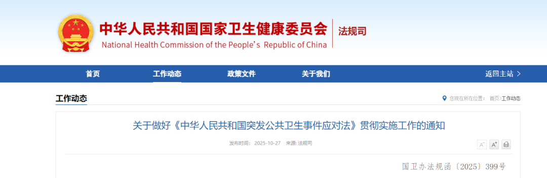《中华人民共和国突发公共卫生事件应对法》(以下简称《突发公共卫生事件应对法》)已于2025年9月12日经第十四届全国人民代表大会常务委员会第十七次会议审议通过,自2025年11月1日起施行。为做好《突发公共卫生事件应对法》贯彻实施工作,现就有关事项通知如下: