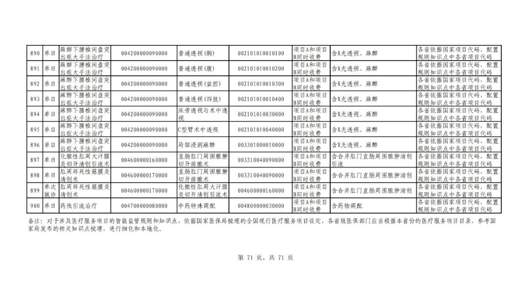 需要说明的是,对于涉及医疗服务项目的智能监管规则和知识点,我们是依据国家医保局梳理的全国现行医疗服务项目设定的,是为全国“打样”,各省级医保部门应当结合本省份的医疗服务项目目录,参考国家医保局发布的相关知识点梳理,进行细化和本地化。对于相关知识点涉及的医保药品、医用耗材代码等,受梳理工作与发布工作时间差影响,可能存在最新代码未纳入的情况,各省级医保信息平台在本地化过程中,应结合最新的医保药品、医用耗材分类与代码数据库更新情况进行增补。
