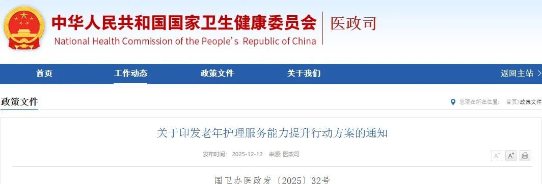 为深入贯彻实施积极应对人口老龄化国家战略,着力提升老年护理服务能力,有效对接老年人多元化、差异化护理服务需求,国家卫生健康委、国家医保局、国家中医药局、国家疾控局制定了《老年护理服务能力提升行动方案》。现印发给你们,请结合工作实际,认真组织实施。